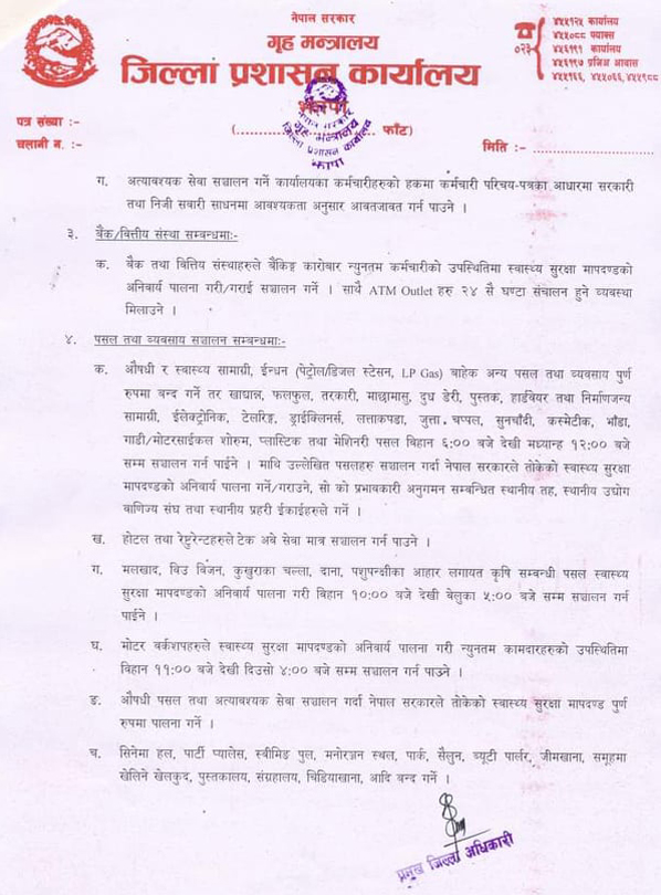 अत्यावश्यक सेवा बाहेकका कुनैपनि सरकारी कार्यालय, सार्वजनिक सस्थान, वीमा लगायतका कार्यालयहरुले सेवा प्रभाह नर्गन र न्युनतम कर्मचारी राखेर आन्तरिक कार्य मात्र गर्न भनिएको छ ।