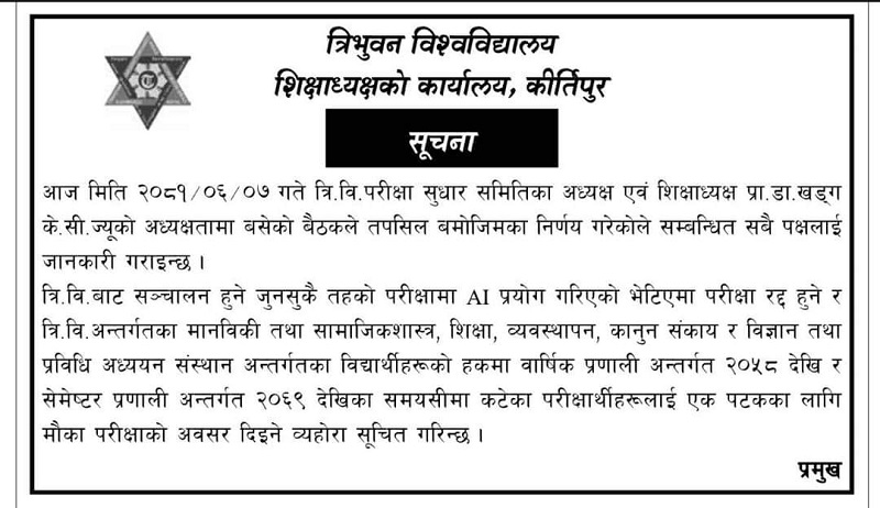 मानविकी तथा सामाजिक शास्त्र, व्यवस्थापन, शिक्षा, कानून, विज्ञान तथा प्रविधि अध्ययन संस्थानका २०५८ सालदेखिका वार्षिक प्रणाली अन्तर्गत र २०६९ सालदेखिका सेमेस्टर प्रणालीका विद्यार्थीका लागि एक पटक मौका परीक्षा सञ्चालन गर्ने उल्लेख छ । साथै जुनसुकै तहको परीक्षामा एआई प्रयोग गरिएको भेटिएमा परीक्षा रद्द हुनेछ ।